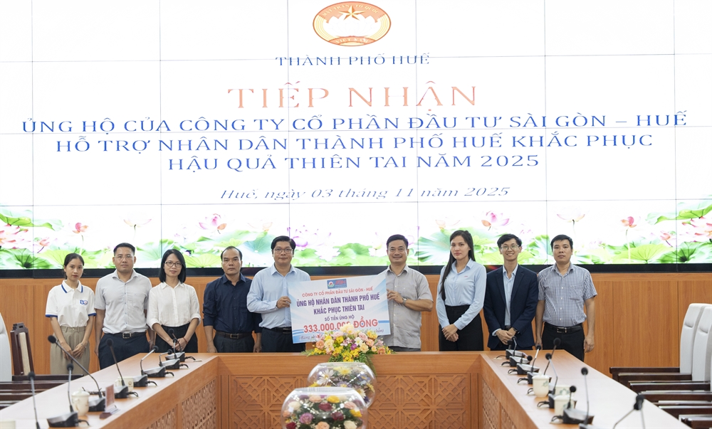 Chiều cùng ngày 3/11, tại trụ sở UBND thành phố Huế, Công ty Cổ phần Đầu tư Sài Gòn – Huế đã trao tặng 333 triệu đồng hỗ trợ người dân thành phố Huế khắc phục hậu quả thiên tai do đợt mưa lũ vừa qua gây ra.