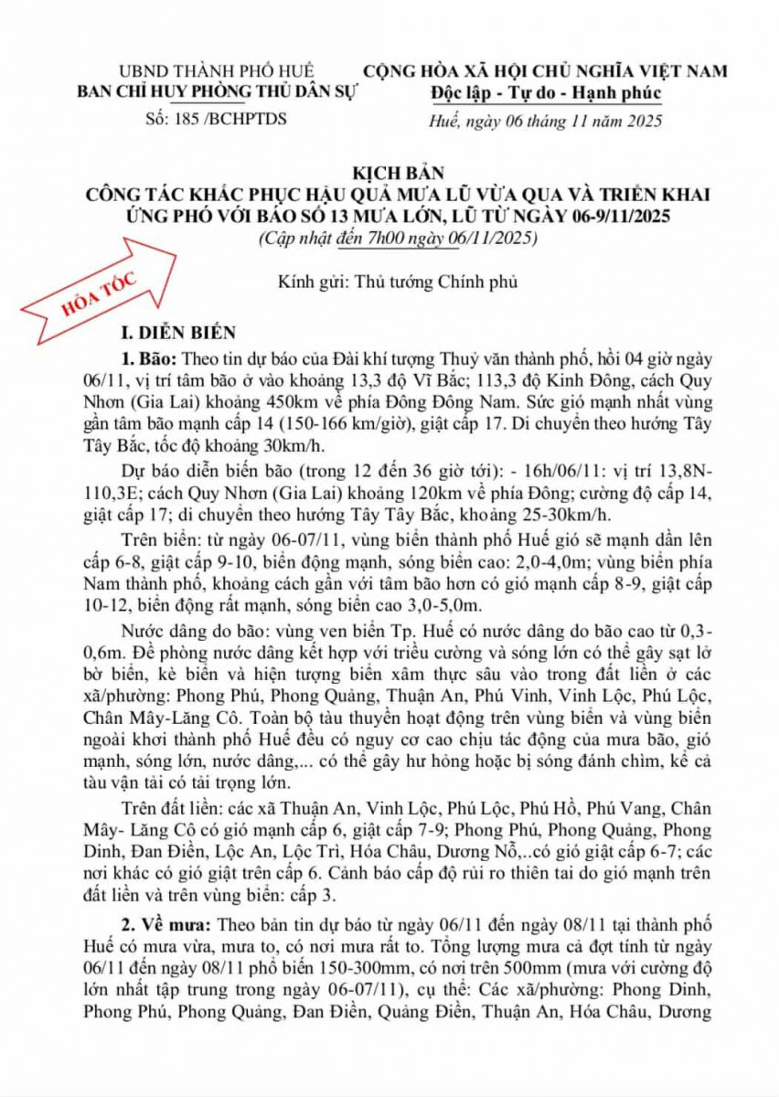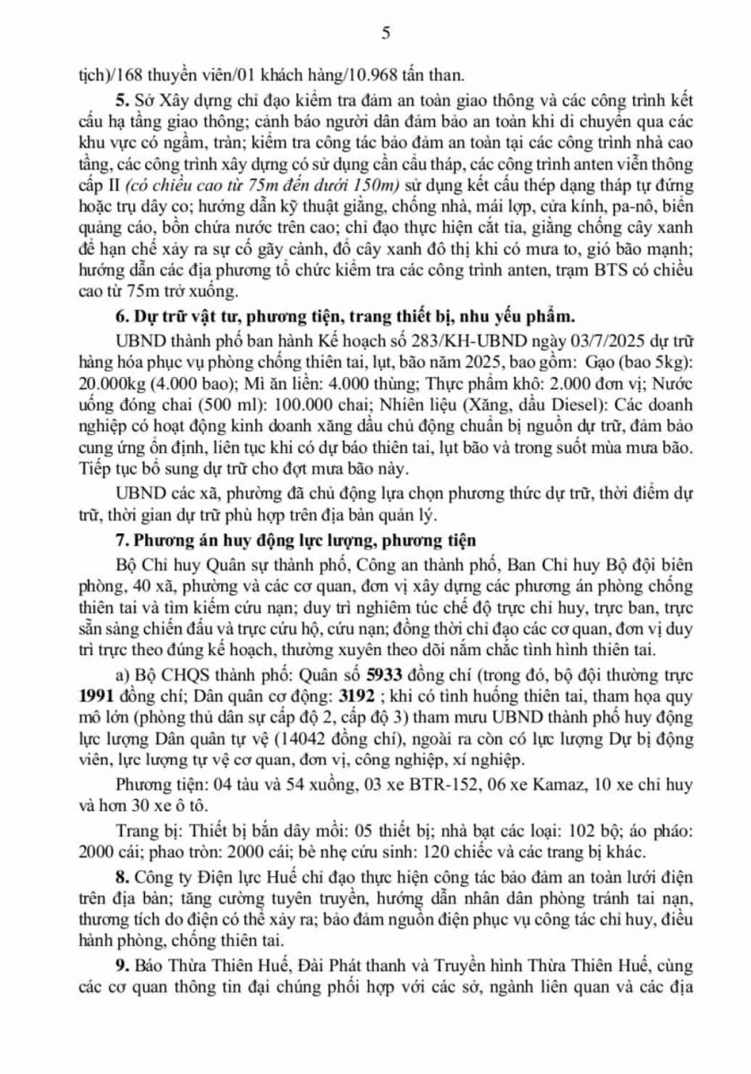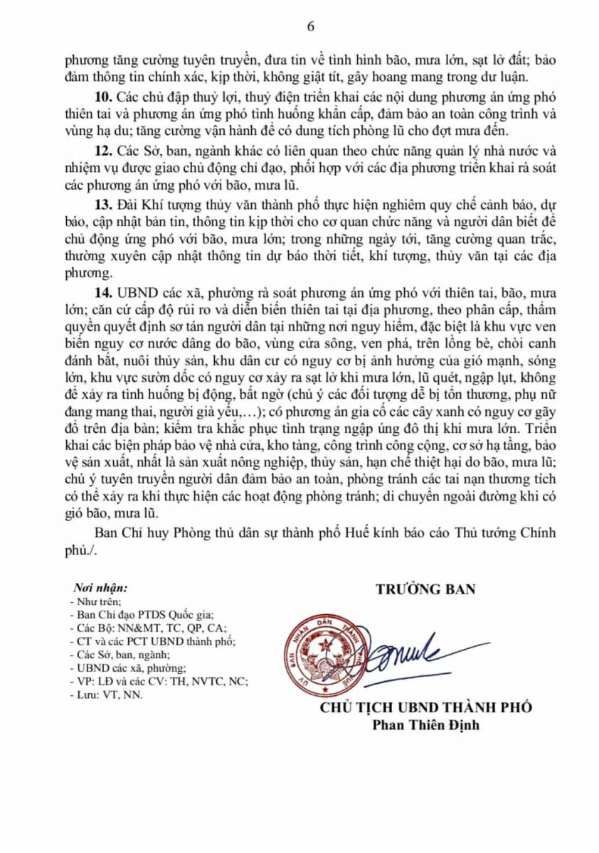 Để chuẩn bị ứng phó bão, Ban chỉ huy Phòng thủ dân sự TP Huế yêu cầu các địa phương rà soát, cập nhật chi tiết từng phương án ứng phó với bão, nước dâng do bão với 10.132 hộ/32.697 khẩu. Đối với bão số 13 phương án di dời 3.038 hộ/9.977 khẩu tập trung chủ yếu tại khu vực ven biển, đầm phá, sạt lở xung yếu.