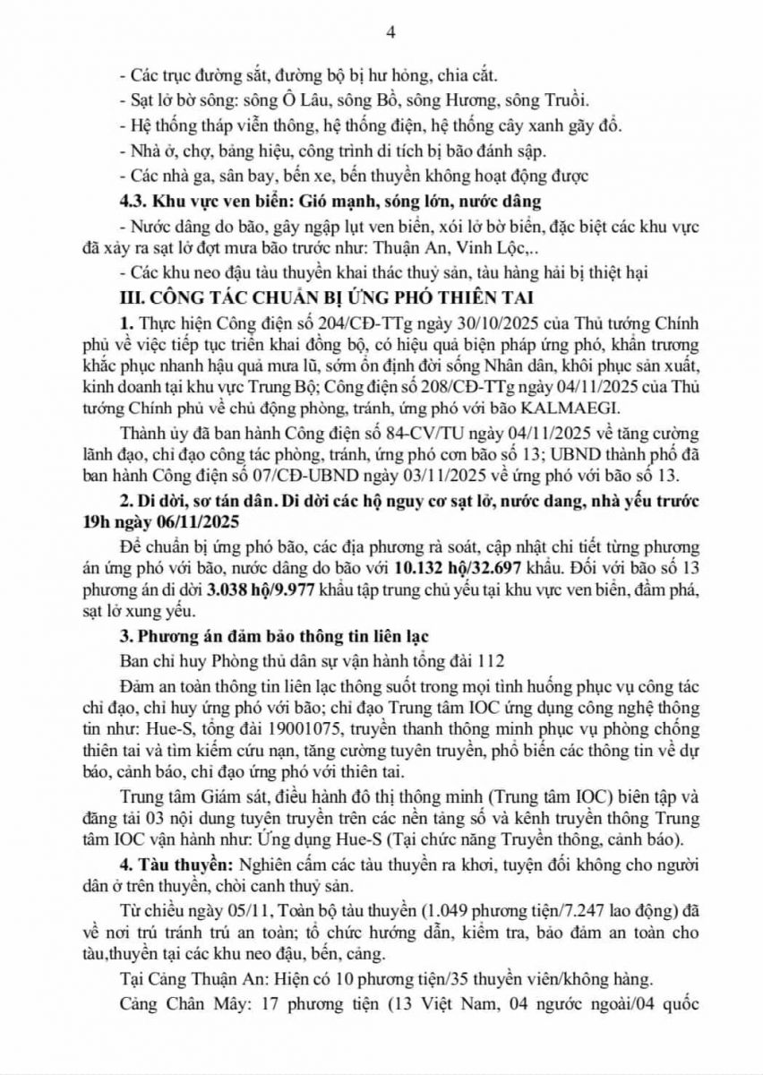 Thực hiện Công điện số 204/CĐ-TTg ngày 30/10/2025 của Thủ tướng Chính phủ về việc tiếp tục triển khai đồng bộ, có hiệu quả biện pháp ứng phó, khẩn trương khắc phục nhanh hậu quả mưa lũ, sớm ổn định đời sống Nhân dân, khôi phục sản xuất, kinh doanh tại khu vực Trung Bộ; Công điện số 208/CĐ-TTg ngày 04/11/2025 của Thủ tướng Chính phủ về chủ động phòng, tránh, ứng phó với bão KALMAEGI. Thành ủy đã ban hành Công điện số 84-CV/TU ngày 04/11/2025 về tăng cường lãnh đạo, chỉ đạo công tác phòng, tránh, ứng phó cơn bão số 13; UBND thành phố đã ban hành Công điện số 07/CĐ-UBND ngày 03/11/2025 về ứng phó với bão số 13.