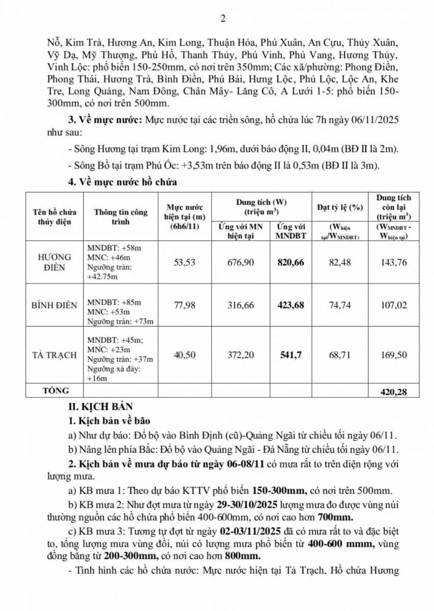 Mực nước tại các triền sông, hồ chứa lúc 7h ngày 06/11/2025. Sông Hương tại trạm Kim Long: 1,96m, dưới báo động II, 0,04m (BĐ II là 2m). Sông Bồ tại trạm Phú Ốc: +3,53m trên báo động II là 0,53m (BĐ II là 3m).