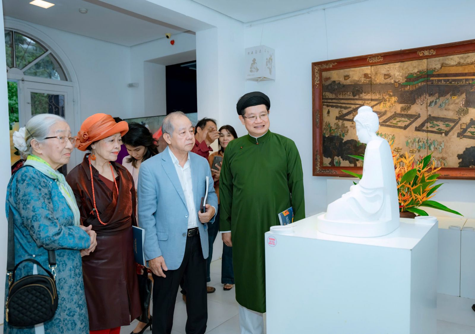 Ông Phan Ngọc Thọ - Nguyên Phó Bí thư Tỉnh ủy Thừa Thiên Huế, và TS Phan Thanh Hải, Giám đốc Sở Văn hóa và Thể thao TP Huế bên tác phẩm Tượng Phật Thích Ca, Thạch cao 110x170cm (1995), của Lê Thành Nhơn