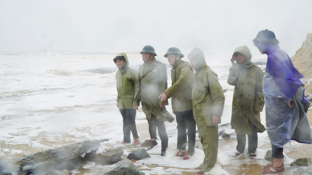 Tiếp đó, tại phường Thuận An, đoàn công tác kiểm tra khu vực bờ biển bị xói lở nghiêm trọng sau các đợt mưa lớn và bão vừa qua. Đoạn qua tổ dân phố Hòa Duân bị sạt lở khoảng 1 km, bờ biển xâm thực sâu vào đất liền từ 50–70 m, ảnh hưởng đến hạ tầng thiết yếu, hoạt động dịch vụ du lịch và tiềm ẩn nguy cơ hình thành cửa biển mới. Thứ trưởng đề nghị địa phương khẩn trương rà soát mức độ nguy hiểm, triển khai biện pháp bảo vệ bờ biển và đảm bảo an toàn cho người dân khu vực lân cận.
