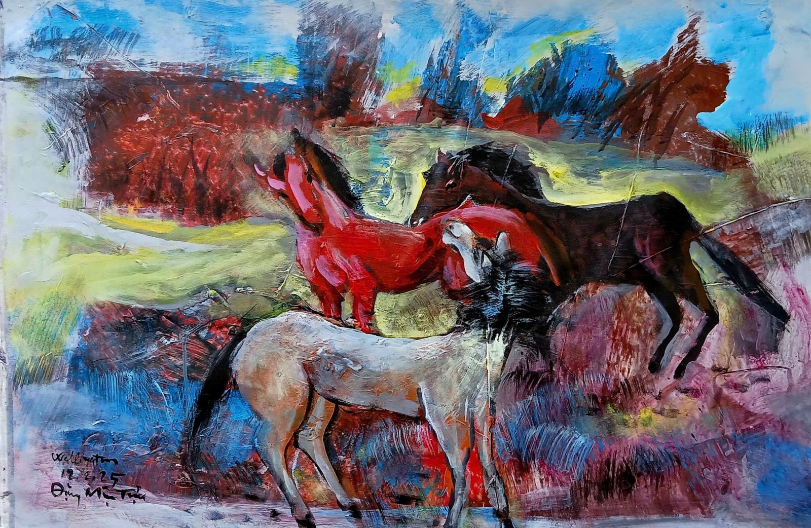 Và cuối cùng, hẳn không thể thiếu được hình ảnh của con giáp thứ bảy - năm Bính Ngọ 2026 với tác phẩm Năm ngựa bởi sự kết nối cảm xúc khi anh bắt gặp những con ngựa đang yên bình gặm cỏ trên cánh đồng ở một trang trại Lower Hutt, như anh chia sẻ, và tác phẩm Họp bầy mô tả những đàn ngựa với ý nghĩa đoàn kết, nương tựa lẫn nhau, lấy cảm hứng từ câu tục ngữ, “một con ngựa đau cả tàu bỏ cỏ” tại triển lãm Những miền đất nhớ của Đặng Mậu Tựu lần này cùng câu chuyện quen thuộc đối với văn nghệ sĩ Huế về triển lãm tranh con giáp tại nhà ông hàng năm vào dịp Tết Nguyên đán.