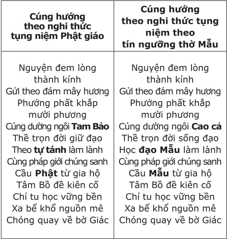 Với tâm thức đa thần và tâm lý cởi mở, người Việt cho dù sống dưới các triều đại phong kiến luôn đề cao hệ tư tưởng Nho giáo, nhưng họ vẫn luôn có đức tin vào Phật và tín ngưỡng thờ Mẫu. Bên cạnh đó, chúng ta thấy được là nhu cầu của người dân, nhu cầu của những người thực hành tín ngưỡng thờ Mẫu và của những nhà sư Phật giáo đều mong muốn có sự gắn bó giữa tín ngưỡng này với Phật giáo. Đây không chỉ là nhu cầu thỏa mãn niềm tin tôn giáo khi họ cảm thấy mình có thêm nhiều đối tượng thờ phụng để gia tăng cảm giác an toàn hiện sinh, được che chở phù hộ. Đối với Phật giáo, các nhà sư nhận thấy là muốn đưa tôn giáo này thâm nhập và phát triển sâu rộng trong quần chúng nhân dân, trở thành căn tính văn hóa thì không thể xóa bỏ tín ngưỡng thờ Mẫu. Để tồn tại trong văn hóa Việt, Phật giáo không thể không nương tựa vào tín ngưỡng thờ Mẫu, cũng từ đây trong điện thờ Phật thì có thêm không gian thờ của các vị Thánh Mẫu, chính điều này tạo nên lối kiến trúc thờ tự “tiền Phật hậu Mẫu” hay “tiền Phật hậu Thánh”. Và để đáp ứng được nhu cầu của người dân, Phật giáo đã phải thích nghi, biến đổi, phải bản địa hóa và những bản kinh, chú trong Phật giáo đã xuất hiện trong khóa lễ, nghi lễ hầu đồng8 của những người thực hành tín ngưỡng thờ Mẫu.