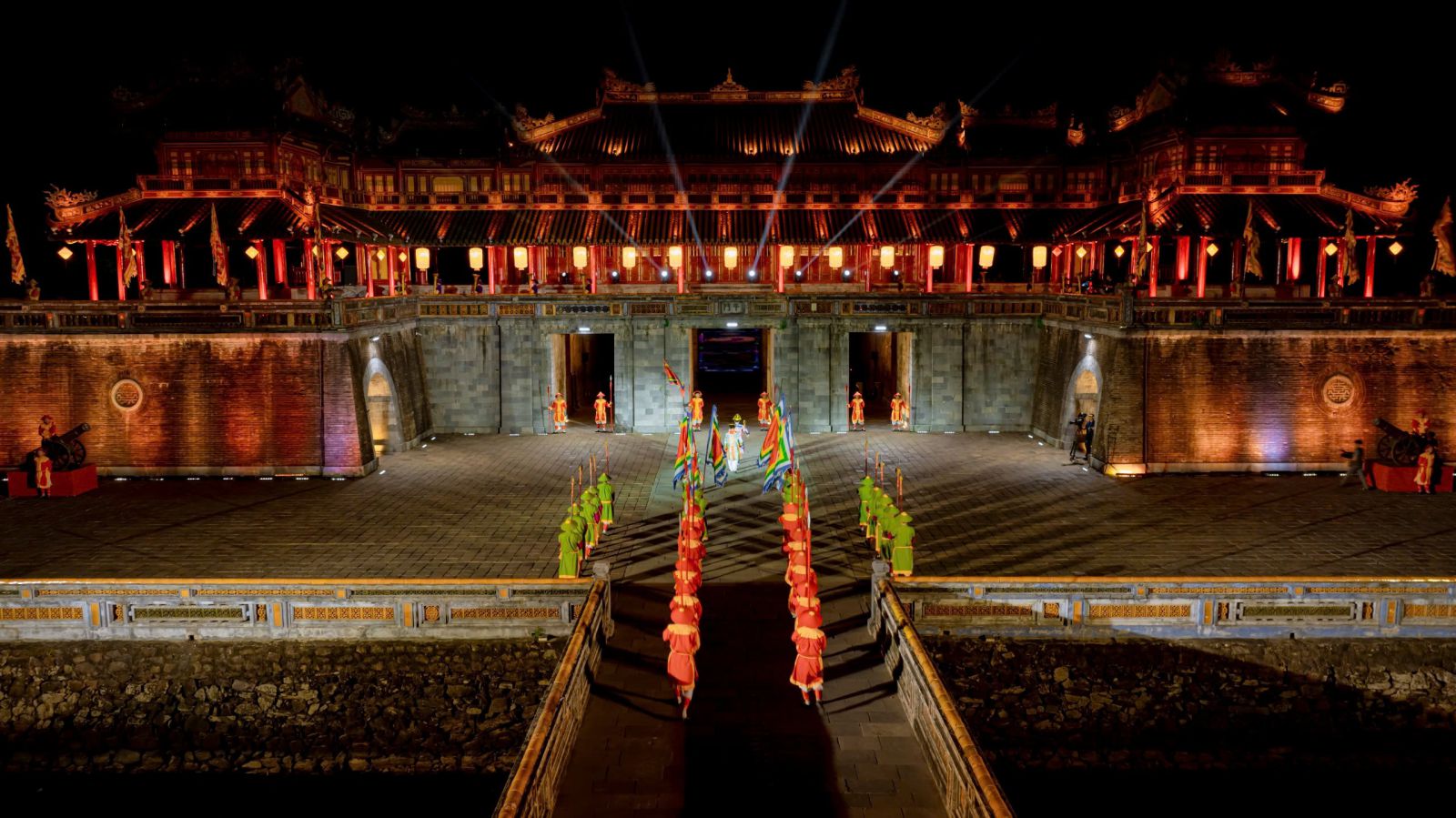 Chương trình “Hoàng cung huyền ảo” được dàn dựng công phu, khai thác chiều sâu giá trị di sản để “đánh thức” Hoàng cung về đêm. Mở đầu chương trình là hoạt động đặc sắc như lễ đổi gác tại Ngọ Môn.