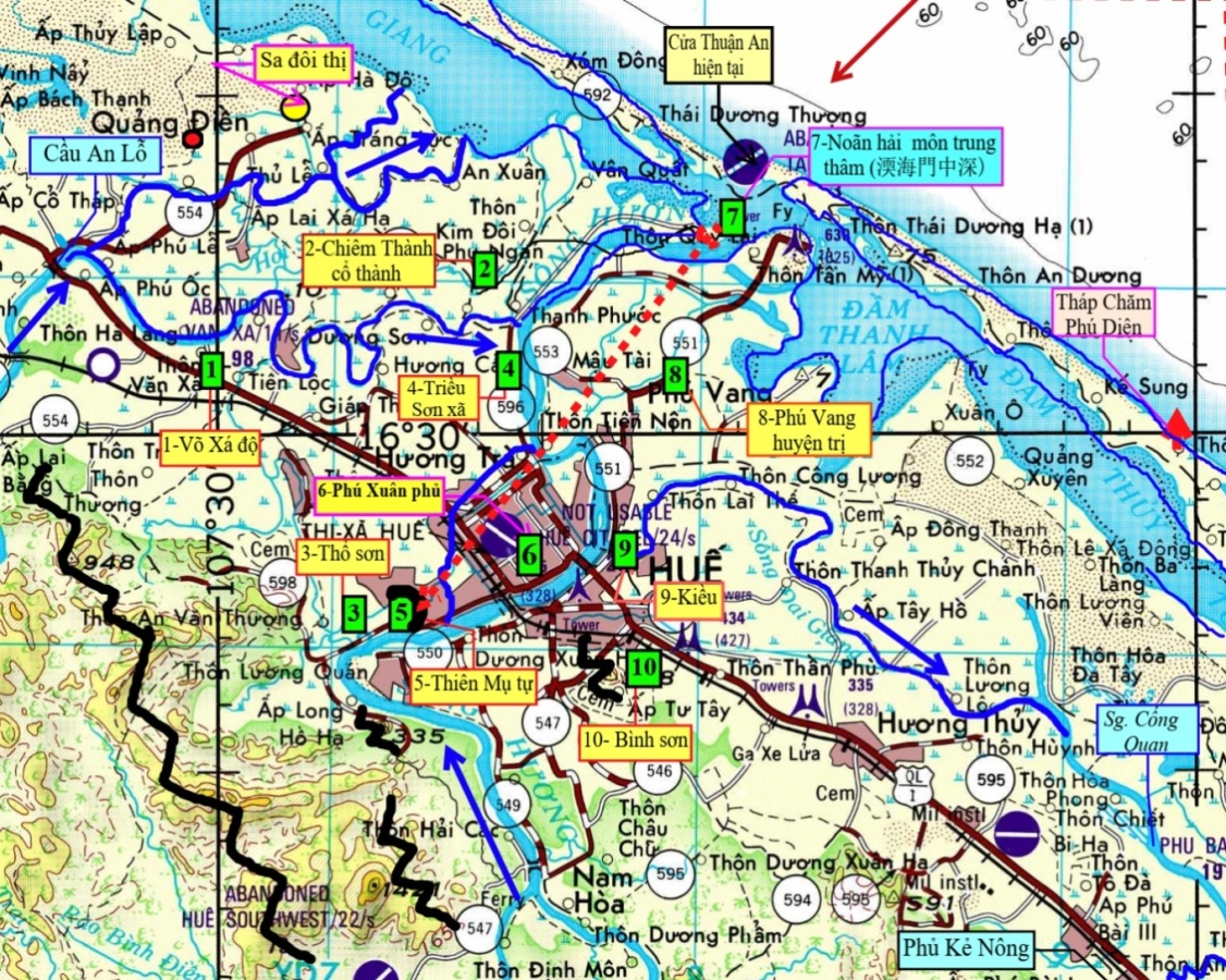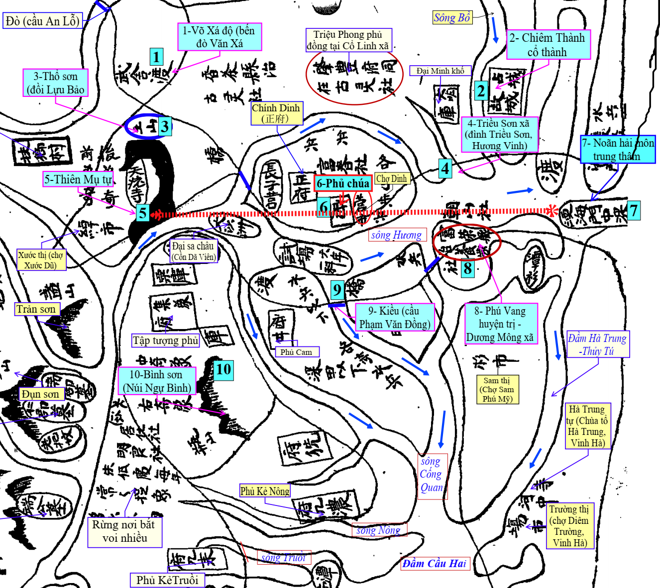 Hình số 01: Trích đoạn khoảng vị các địa danh được lấy làm mốc trên tờ đồ bản 1774 khi định vị đối sánh với địa lý ngày nay. Không gian được xét bao hàm khu vực từ nam phá Tam Giang đến đầm Cầu Hai trong đó kinh đô Phú Xuân/Huế (số 6) là trung tâm. Ghi chú: 1-Võ Xá độ; 2- Chiêm Thành cổ thành; 3- Thổ sơn; 4- Triều Sơn xã; 5- Thiên Mụ tự; 6- Phủ chúa (cung Đại Nội); 7- Noãn hải môn trung thâm (cửa sông Hương); 8- Phú  Vang huyện trị; 9- Kiều (cầu Phạm Văn Đồng); 10- Bình sơn (núi Ngự Bình).