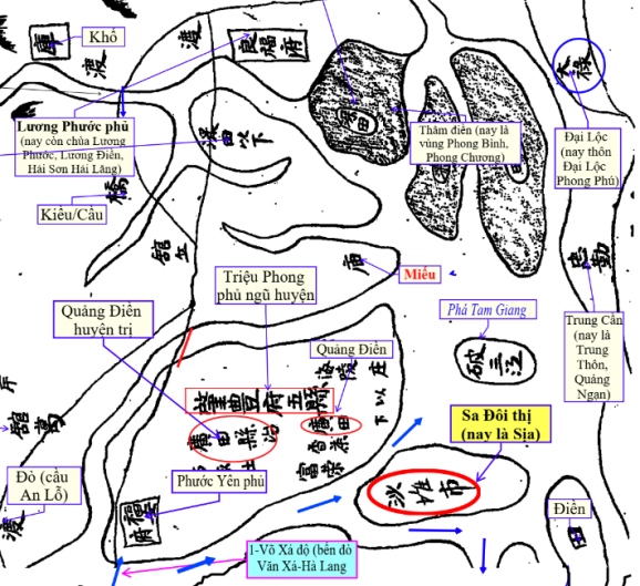 Vậy nước sông Bồ thời 1774 còn đổ ra phá Tam Giang ở khoảng vị nào ngày nay? Sa Đôi thị là như thế nào và khoảng vị ngày nay ở đâu? Theo từ chữ biểu ý thì: Sa (沙) là cát, hạt cát; Đôi (堆) là tích tụ, dồn, chất đống, chồng xếp như đồi nhỏ và thị (市) là đô thị (chợ). Cổ địa lý tự nhiên qua các thời kỳ đã hình tạo các dãy cồn cát biển xếp lớp, chồng chất kéo dài rộng khắp huyện Phong Điền. Trên đồ bản 1774, khoảng vị Sa Đôi thị thuộc phần thấp dưới kề cạnh phá Tam Giang. Nơi tập trung dân cư (thị/chợ) ven cồn cát dồn xếp chất đống như đồi (Sa Đôi) kề cạnh phá Tam Giang chính là thị trấn Sịa ngày nay (xem hình số 2 và số 3).