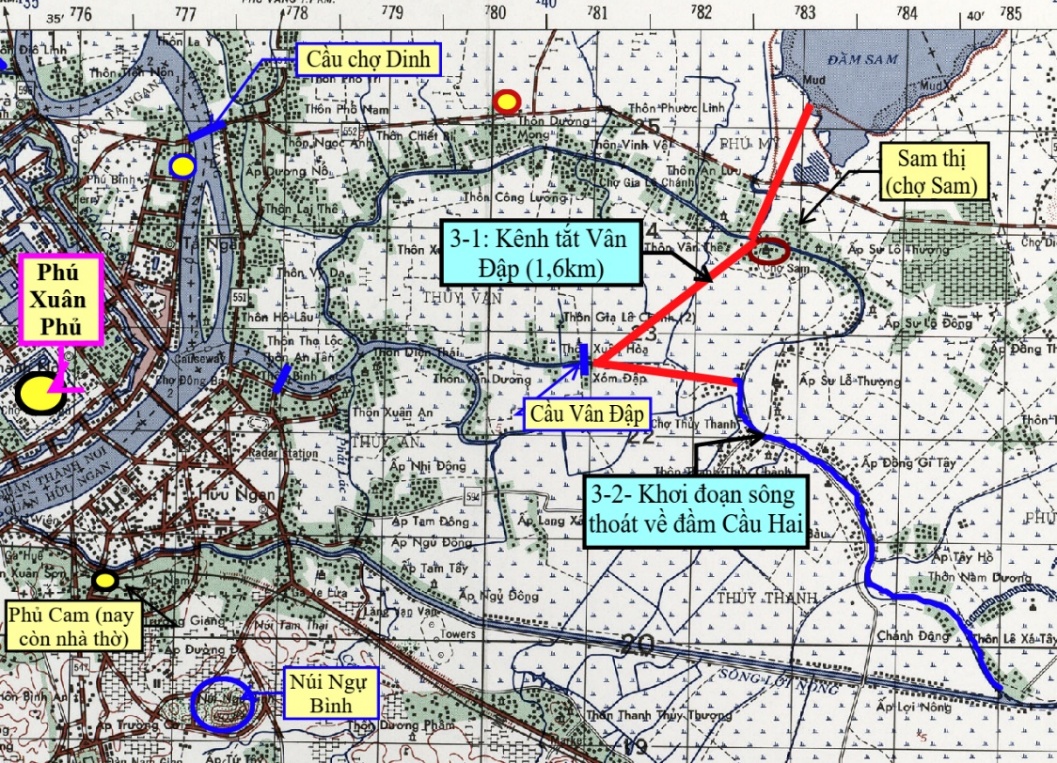 3-1: Mở kênh tắt từ cầu Vân Đập sang phủ thờ Tôn Thất Thuyết (Thủy Phong) khoảng 1,6km. 3-2: Đồng thời khơi thoát, mở rộng toàn bộ đoạn sông Như Ý từ cầu Vân Đập - cầu Thống Nhất - cầu Thanh Toàn đến Phú Lương (Phú Vang) nhằm tăng sự thoát lưu nước về đầm Cầu Hai (xem hình số 7).