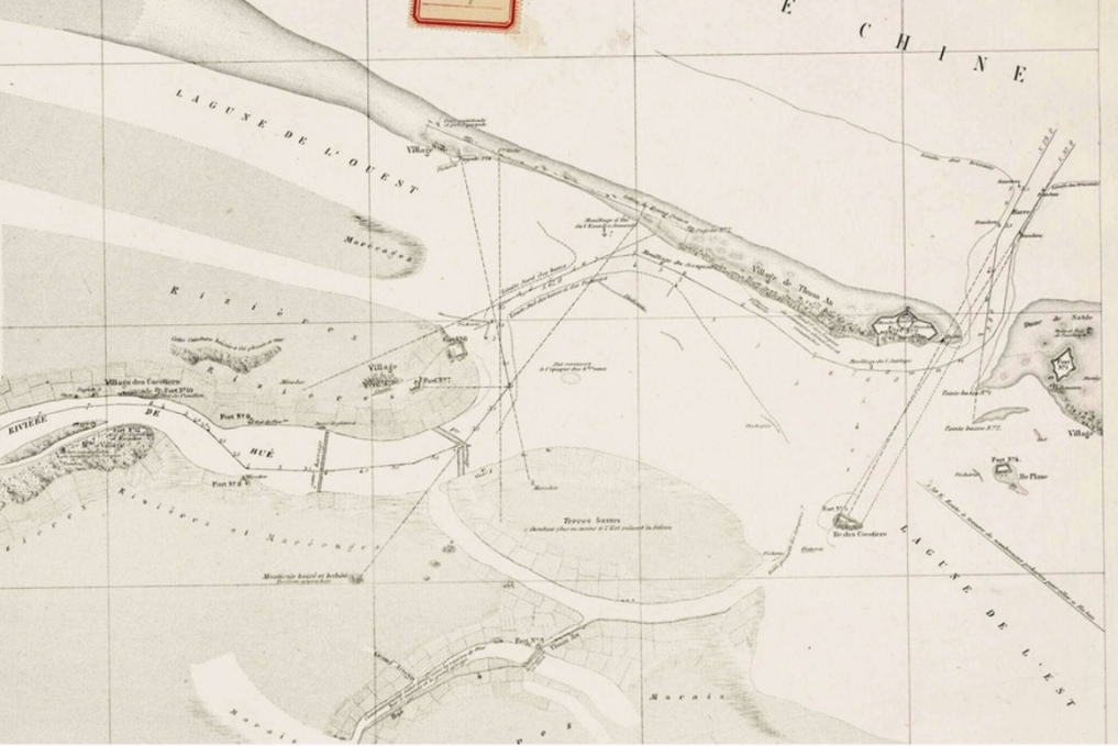 Cửa sông Hương thời năm 1880 - Trích đoạn bản đồ Côte d’ An Nam - Rivière Hue tỷ lệ  1/20.000. (Bờ biển An Nam, sông Huế) do JL. Dutreuil lập vẽ từ 1876 -1877 làm Sơ đồ và kế hoạch hải quân năm 1880.