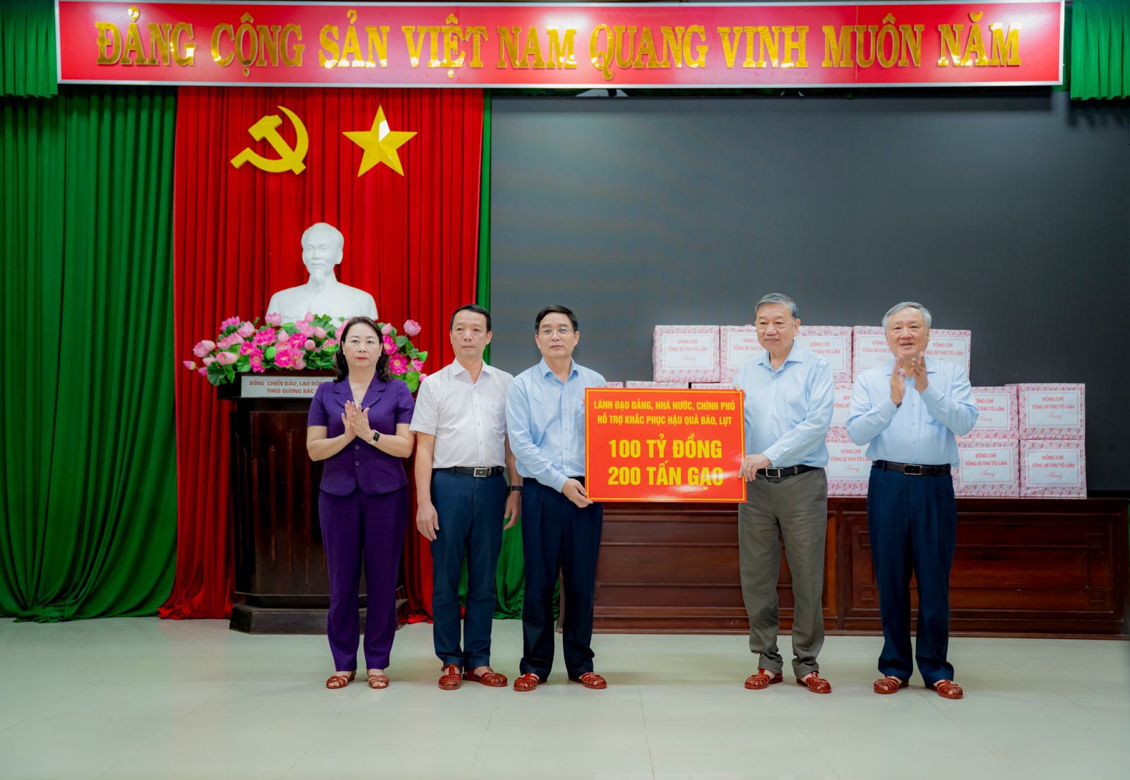 Nhân dịp này, thay mặt lãnh đạo Đảng và Nhà nước, Tổng Bí thư Tô Lâm đã trao 100 tỷ đồng và 200 tấn gạo của Trung ương hỗ trợ thành phố Huế khắc phục hậu quả thiên tai.