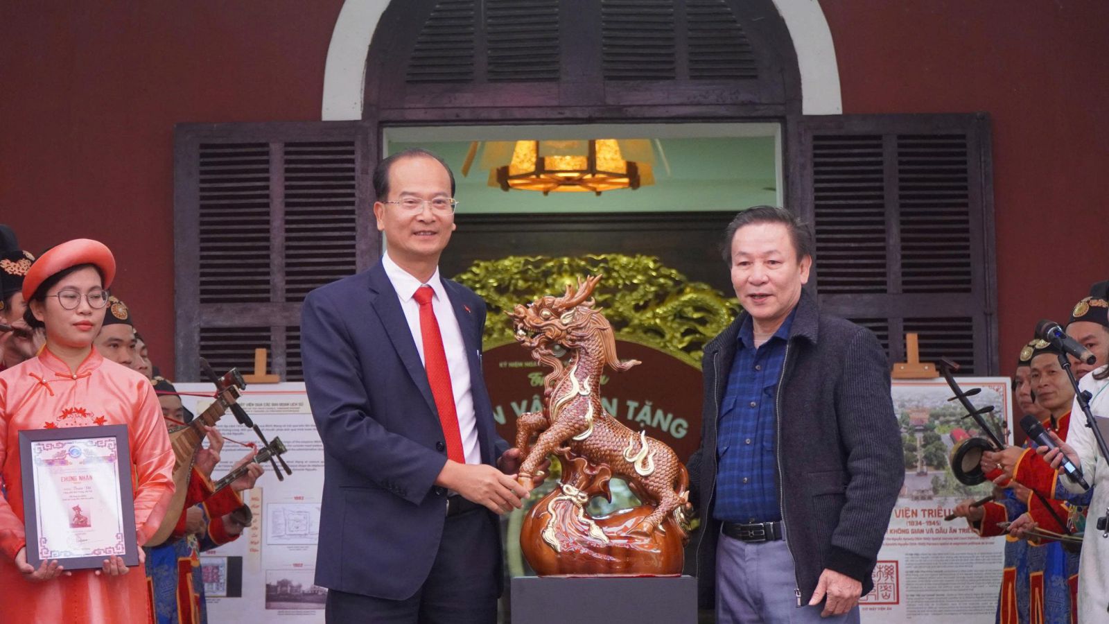 | Nghệ nhân Nhân dân Trần Độ trao tặng tác phẩm " Linh vật Long Mã" cho Trung tâm Bảo tồn Di tích Cố đô Huế để đấu giá nhằm hỗ trợ đồng bào bị ảnh hưởng bởi thiên tai. |