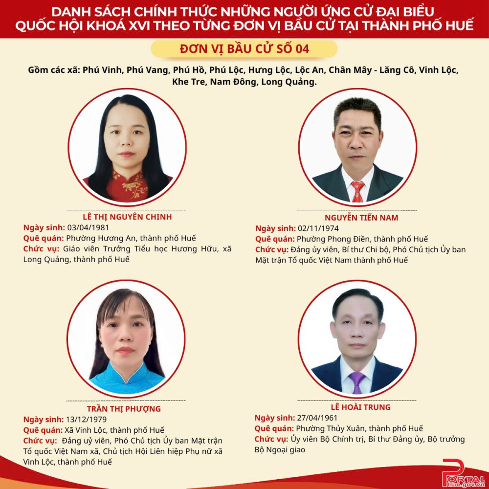 Theo Nghị quyết số 151/NQ-HĐBCQG của Hội đồng Bầu cử quốc gia, danh sách chính thức những người ứng cử đại biểu Quốc hội (ĐBQH) khóa XVI theo từng đơn vị bầu cử trong cả nước đã được công bố. Thành phố Huế được chia thành 4 đơn vị bầu cử; số ĐBQH được bầu là 9, số người ứng cử là 17 người. Trong đó, đơn vị bầu cử số 1, 3 và 4 mỗi đơn vị bầu 2 đại biểu (4 ứng cử viên); đơn vị bầu cử số 2 bầu 3 đại biểu (5 ứng cử viên). Theo dõi danh sách cụ thể phía bên dưới: