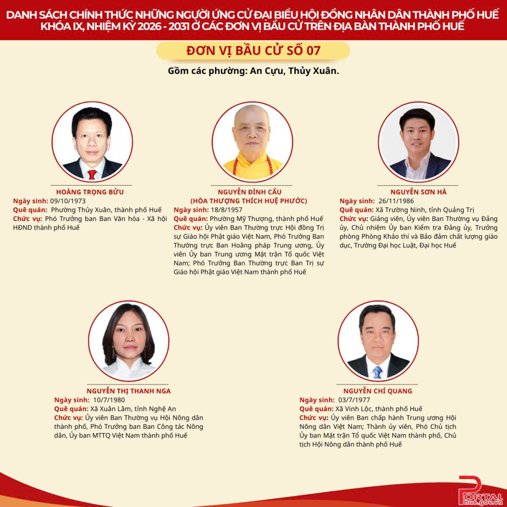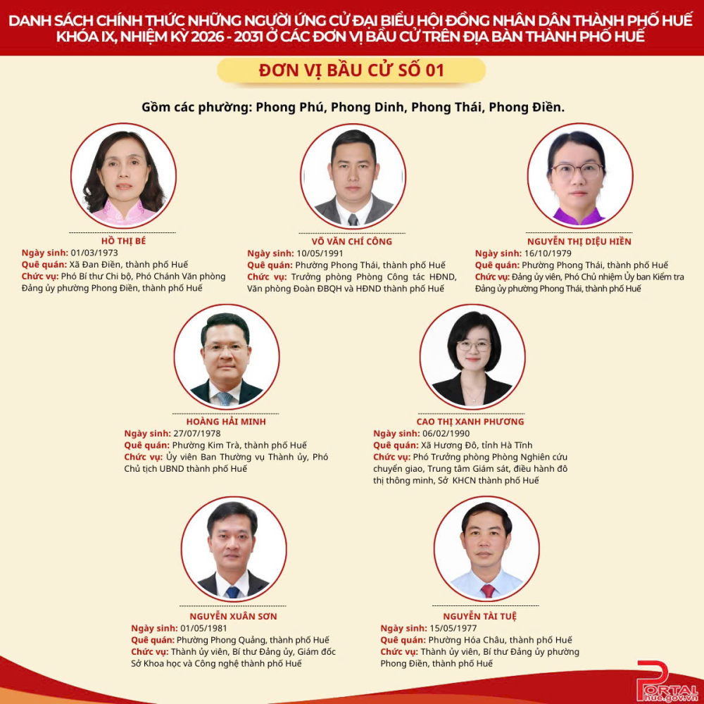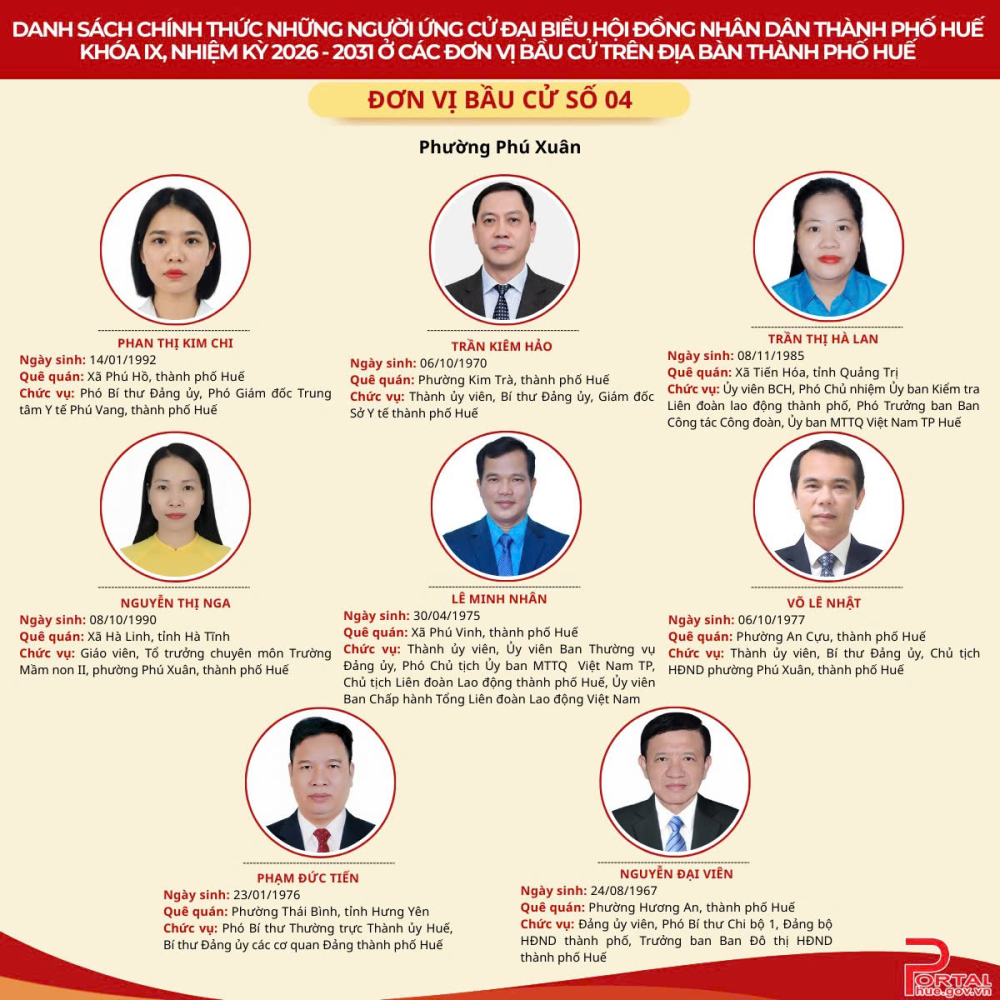Cổng Thông tin điện tử trân trọng giới thiệu danh sách chính thức 90 người ứng cử đại biểu Hội đồng nhân dân (HĐND) thành phố Huế khóa IX, nhiệm kỳ 2026 - 2031 tại 14 đơn vị bầu cử trên địa bàn.