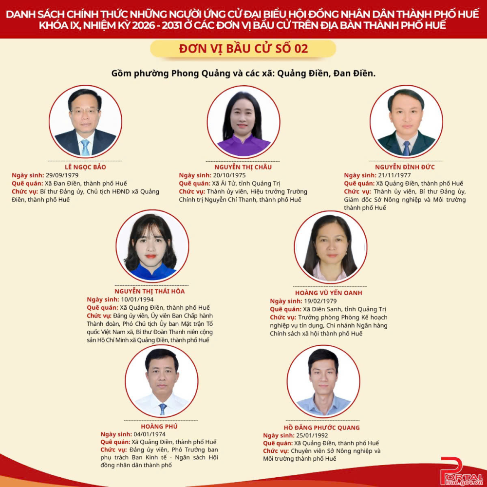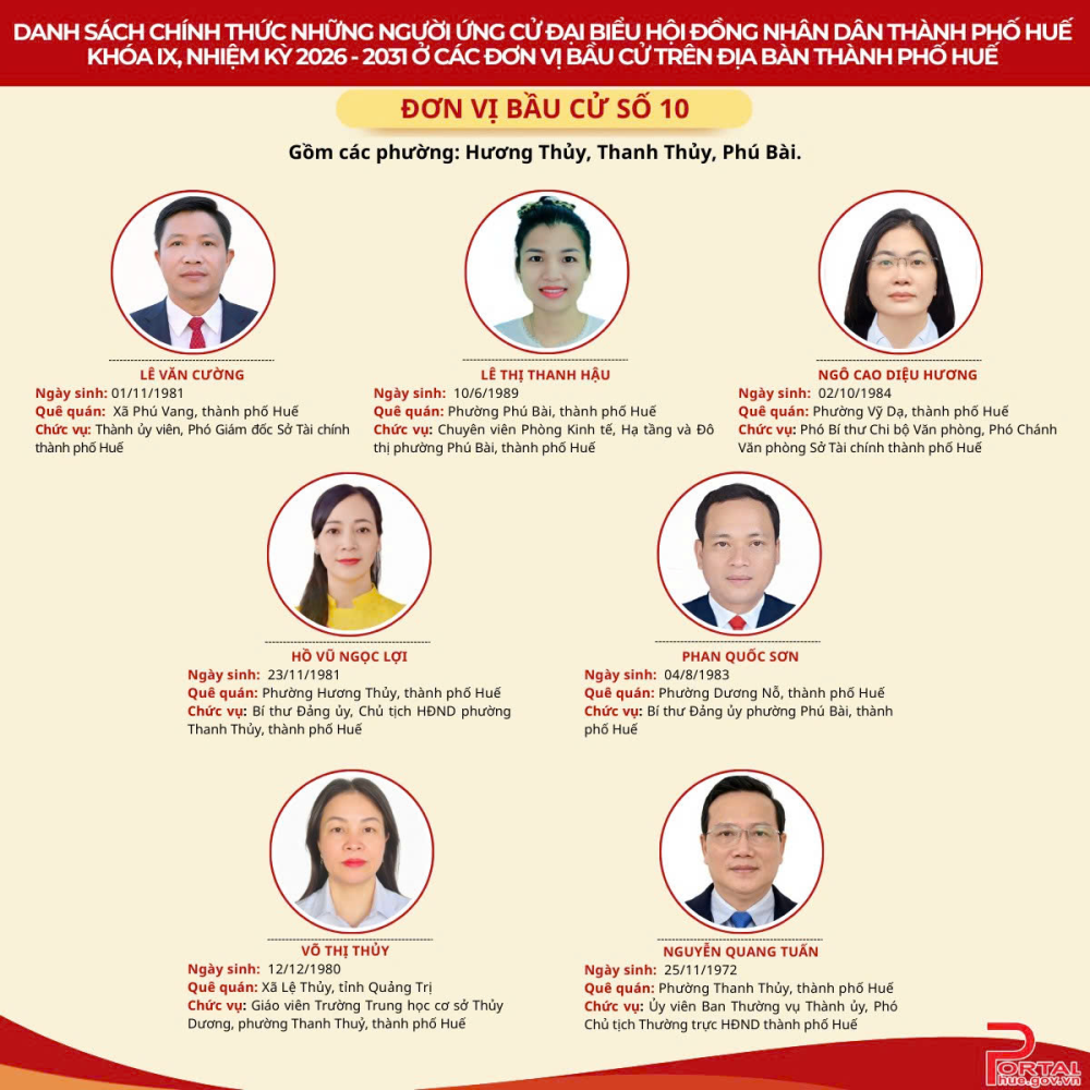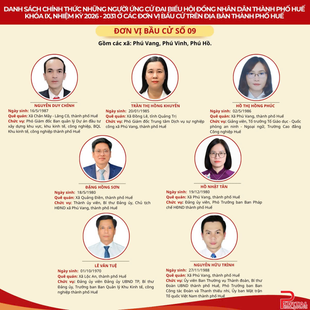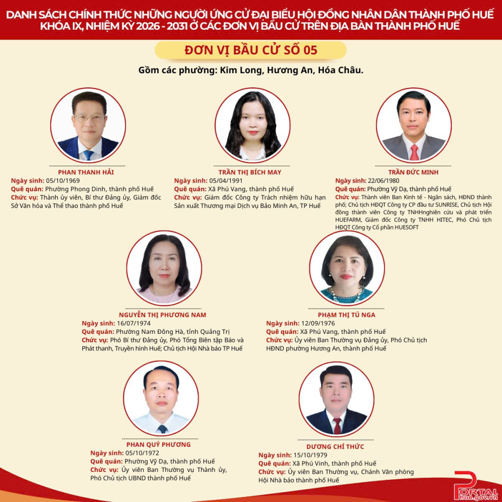 Cổng Thông tin điện tử trân trọng giới thiệu danh sách chính thức 90 người ứng cử đại biểu Hội đồng nhân dân (HĐND) thành phố Huế khóa IX, nhiệm kỳ 2026 - 2031 tại 14 đơn vị bầu cử trên địa bàn.