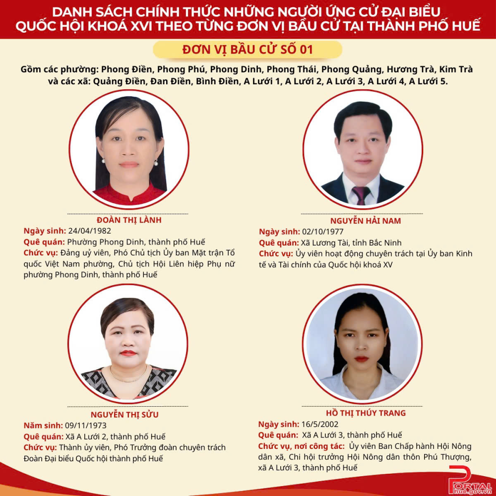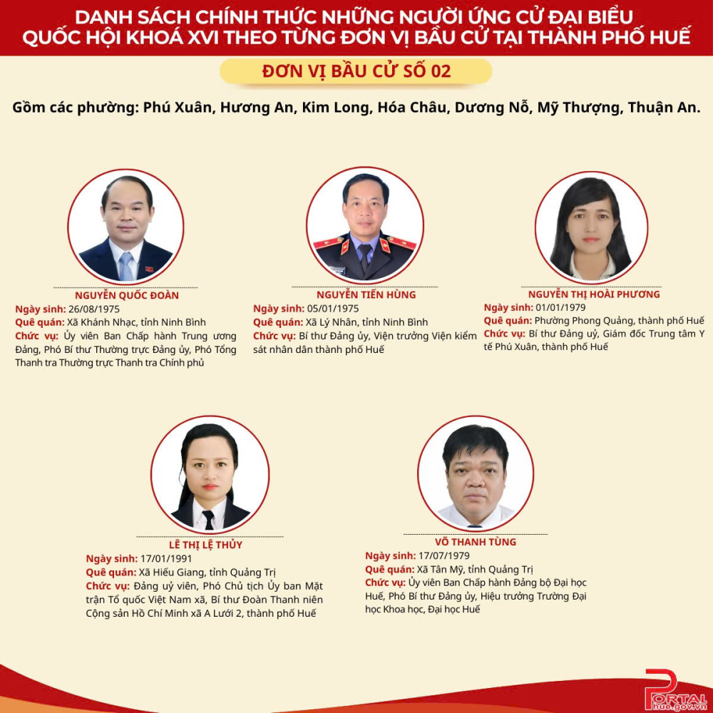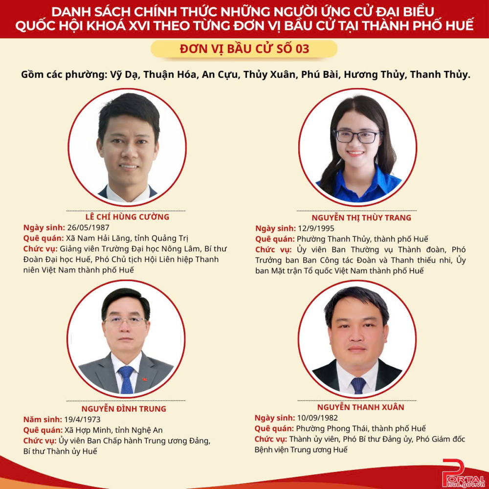 Theo Nghị quyết số 151/NQ-HĐBCQG của Hội đồng Bầu cử quốc gia, danh sách chính thức những người ứng cử đại biểu Quốc hội (ĐBQH) khóa XVI theo từng đơn vị bầu cử trong cả nước đã được công bố. Thành phố Huế được chia thành 4 đơn vị bầu cử; số ĐBQH được bầu là 9, số người ứng cử là 17 người. Trong đó, đơn vị bầu cử số 1, 3 và 4 mỗi đơn vị bầu 2 đại biểu (4 ứng cử viên); đơn vị bầu cử số 2 bầu 3 đại biểu (5 ứng cử viên). Theo dõi danh sách cụ thể phía bên dưới: