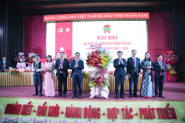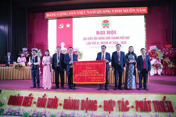 Dịp này, Thành ủy, HĐND, UBND, Mặt trận Tổ quốc Việt Nam thành phố Huế trao tặng Hội nông dân thành phố Huế cờ với dòng chữ "Hội Nông dân thành phố Huế Đoàn kết - đổi mới - hợp tác - phát triển xây dựng thành phố Huế xanh - thông minh - giàu bản sắc". (Ảnh trên)