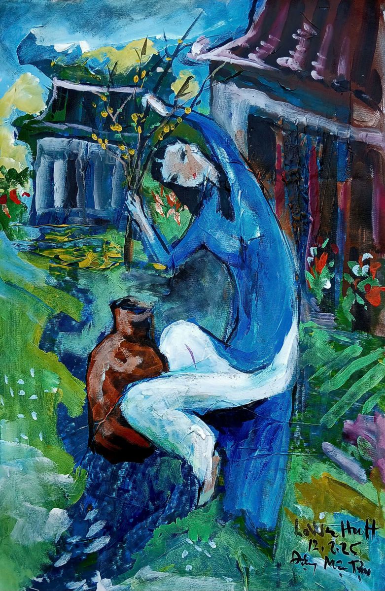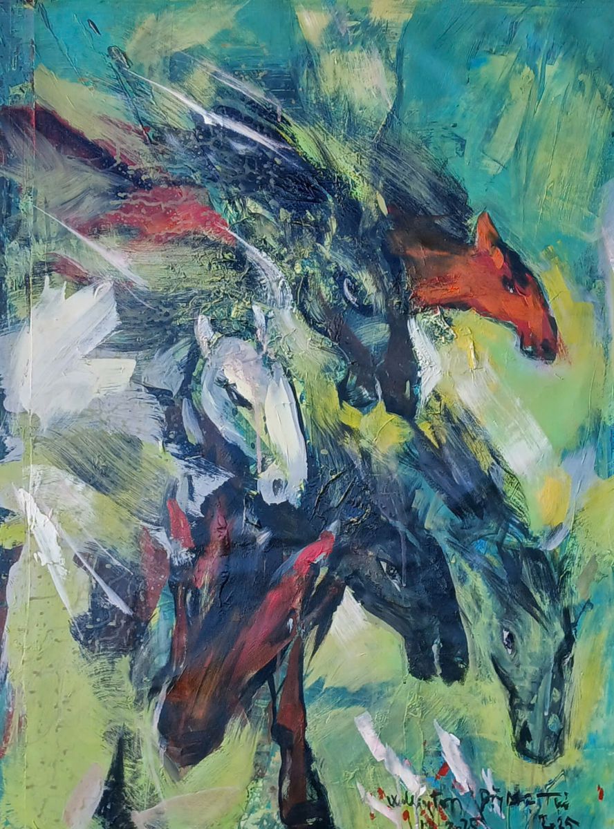 Và cuối cùng, hẳn không thể thiếu được hình ảnh của con giáp thứ bảy - năm Bính Ngọ 2026 với tác phẩm Năm ngựa bởi sự kết nối cảm xúc khi anh bắt gặp những con ngựa đang yên bình gặm cỏ trên cánh đồng ở một trang trại Lower Hutt, như anh chia sẻ, và tác phẩm Họp bầy mô tả những đàn ngựa với ý nghĩa đoàn kết, nương tựa lẫn nhau, lấy cảm hứng từ câu tục ngữ, “một con ngựa đau cả tàu bỏ cỏ” tại triển lãm Những miền đất nhớ của Đặng Mậu Tựu lần này cùng câu chuyện quen thuộc đối với văn nghệ sĩ Huế về triển lãm tranh con giáp tại nhà ông hàng năm vào dịp Tết Nguyên đán.