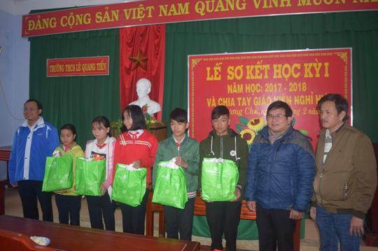 Ông Lê Thanh Tú, Giám đốc siêu thị Co.op mart Huế và Nhà thơ Lê Vĩnh Thái , Phó Tổng biên tập Tạp chí Sông Hương trao quà cho các trẻ mồ côi, học giỏi tại trường THCS Lê Quang Tiến |