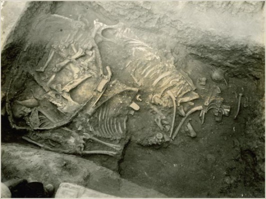 Những lăng mộ vua nhà Thương được khai quật8 và cho thấy các đồ vật chôn theo vua là các đồ trang sức cá nhân và những cái giáo mũi đồng... Ngựa và xe ngựa cũng được chôn cùng với vua (hình trên). Ngay từ đời Thương, Chi thứ 7 được viết là Ngọ 午 chứ không phải là mã 馬. Nếu ban đầu Chi thứ 7 đúng là con ngựa đương nhiên sẽ dùng chữ mã 馬 chứ không thể là chữ ngọ 午 và trong thư tịch Hán, ngọ 午 chưa bao giờ đồng nghĩa hay dùng thay cho 馬. Nguyên thủy, Ngọ 午 thuần túy chỉ thời gian (11 giờ sáng đến 1 giờ chiều là giờ Ngọ), và hiện nay vẫn chưa tìm thấy biểu tượng của nó là con vật nào ở thời đại này, nhưng chỉ đến đời Tần mới thấy Ngọ/lộc (hươu) rồi đời Hán mới thật sự là Ngọ/ mã (ngựa).