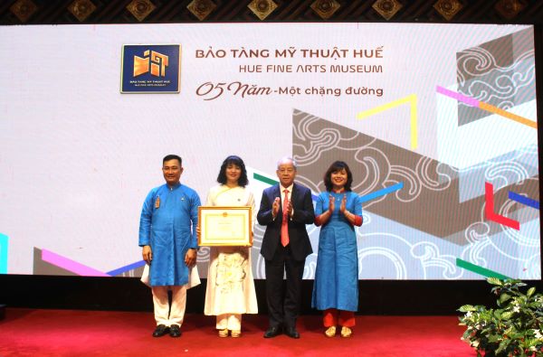 | Đồng chí Phan Ngọc Thọ - Phó Bí thư thường trực Tỉnh ủy trao tặng bằng khen của Ủy ban nhân dân tỉnh cho Bảo tàng Mỹ thuật Huế |