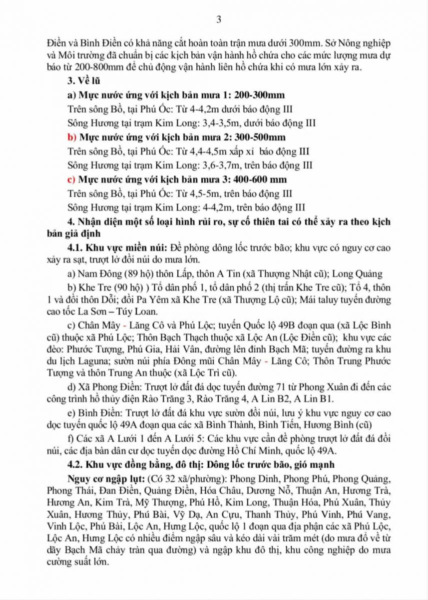 Để chuẩn bị ứng phó bão, Ban chỉ huy Phòng thủ dân sự  TP Huế yêu cầu các địa phương rà soát, cập nhật chi tiết từng phương án ứng phó với bão, nước dâng do bão với 10.132 hộ/32.697 khẩu. Đối với bão số 13 phương án di dời 3.038 hộ/9.977 khẩu tập trung chủ yếu tại khu vực ven biển, đầm phá, sạt lở xung yếu.