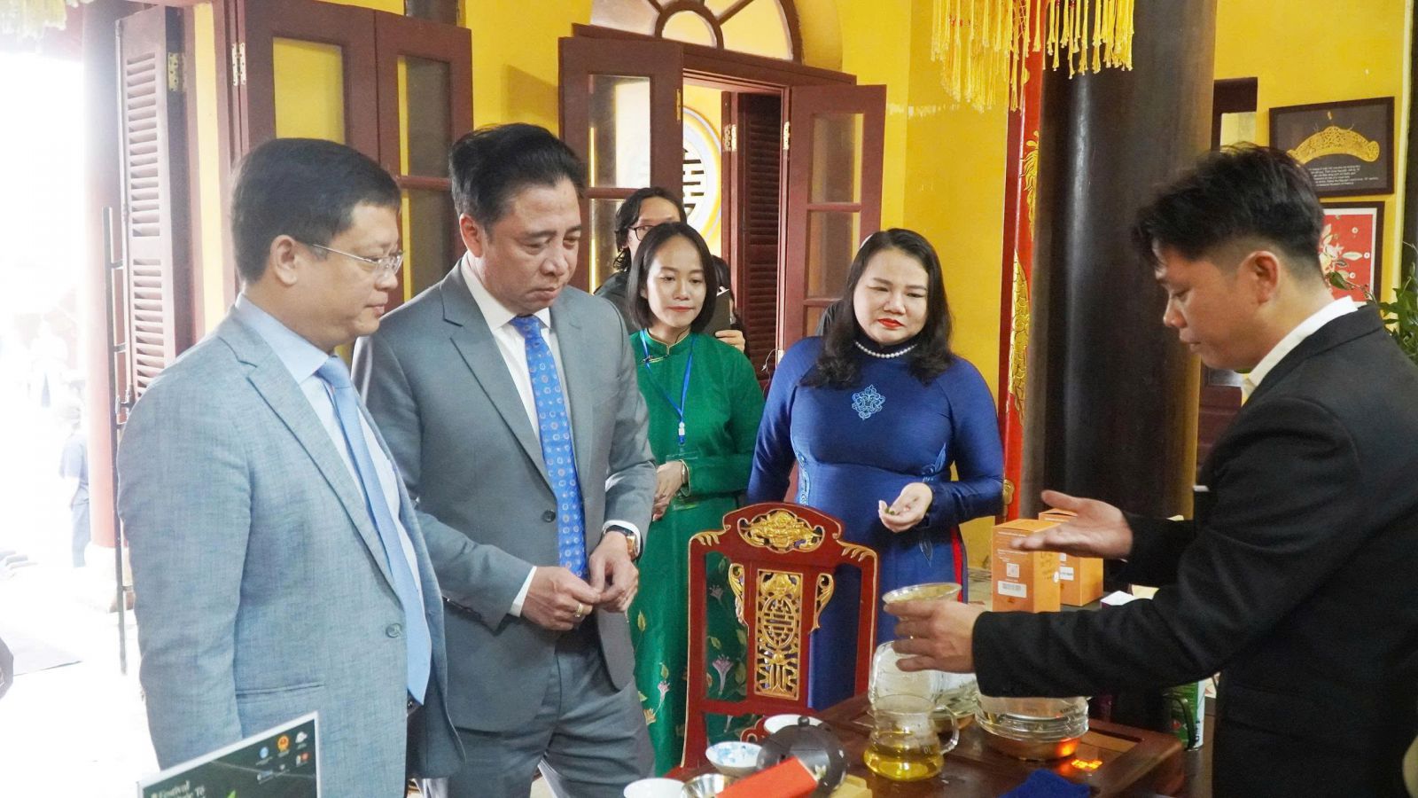 | Lãnh đạo thành phố tham quan và thưởng thức không gian trà được trưng bày và giới thiệu tại chương trình |