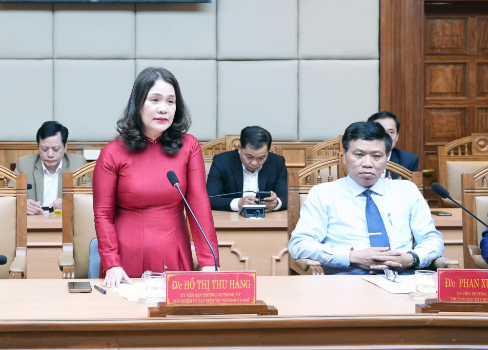 | Đồng chí Hồ Thị Thu Hằng - Tân Chủ nhiệm Ủy ban Kiểm tra Thành ủy Huế phát biểu nhận nhiệm vụ |