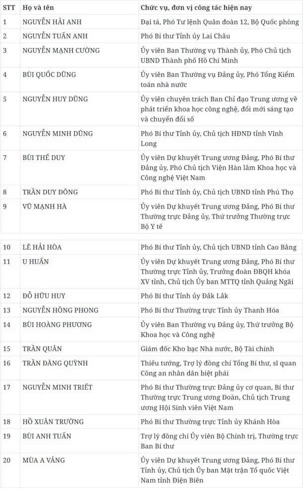 Danh sách 20 Ủy viên dự khuyết Ban Chấp hành Trung ương Đảng khóa XIV: