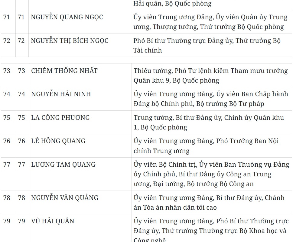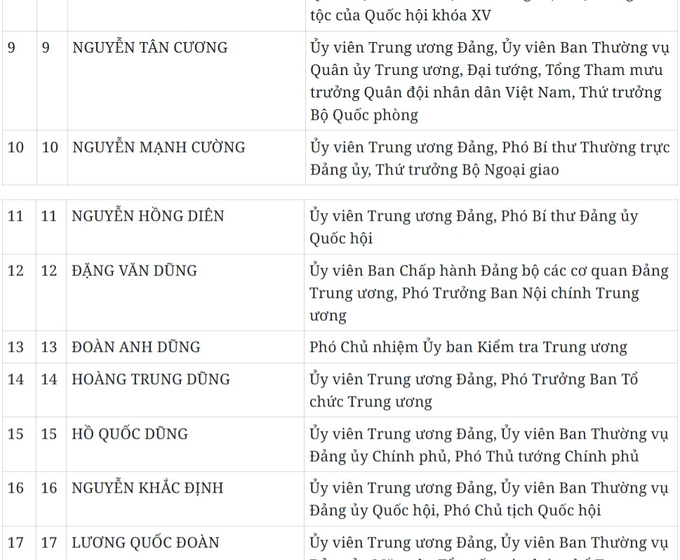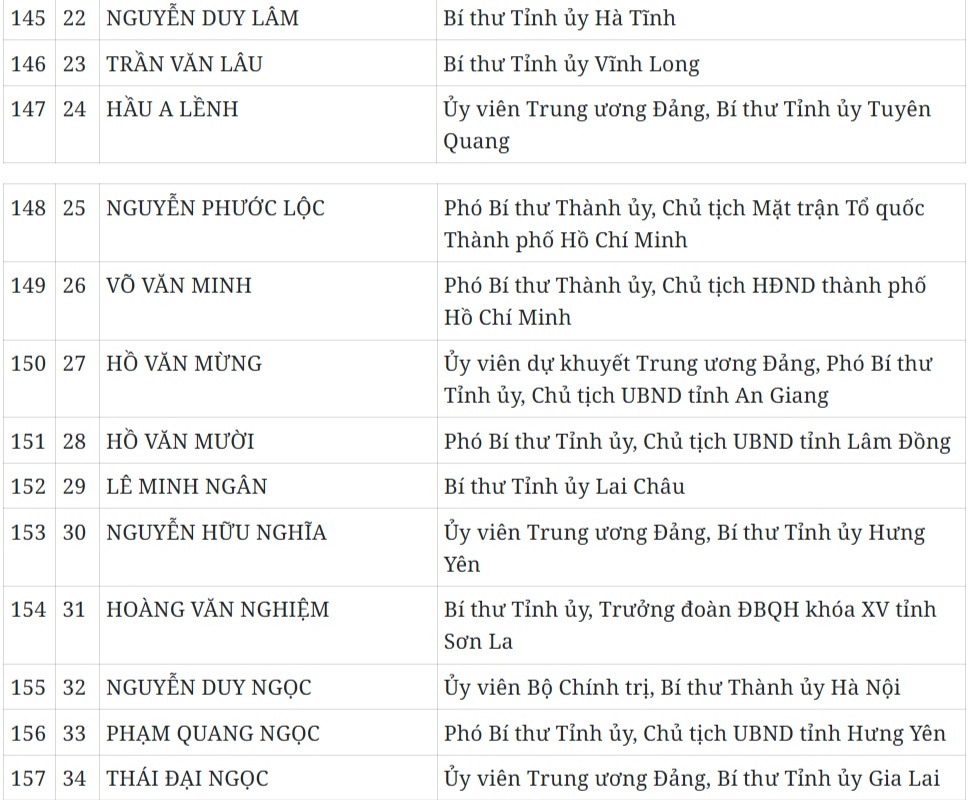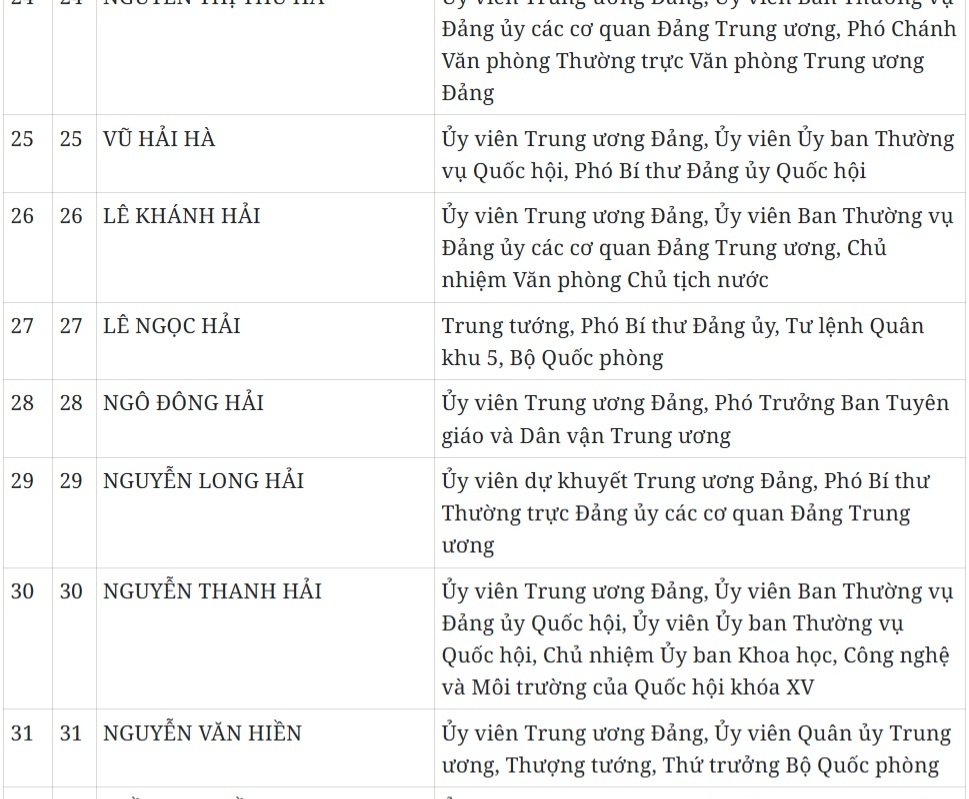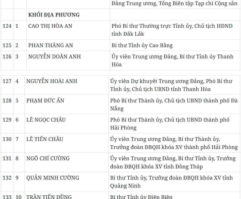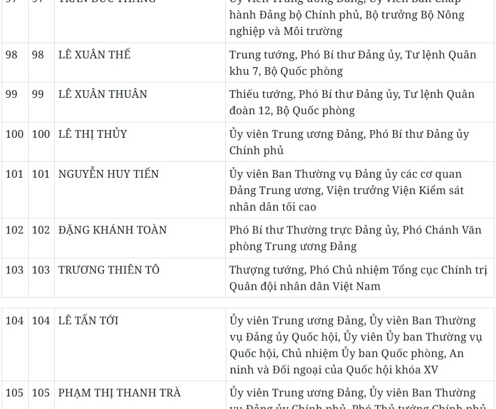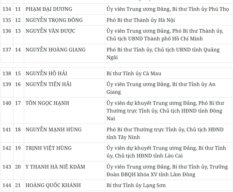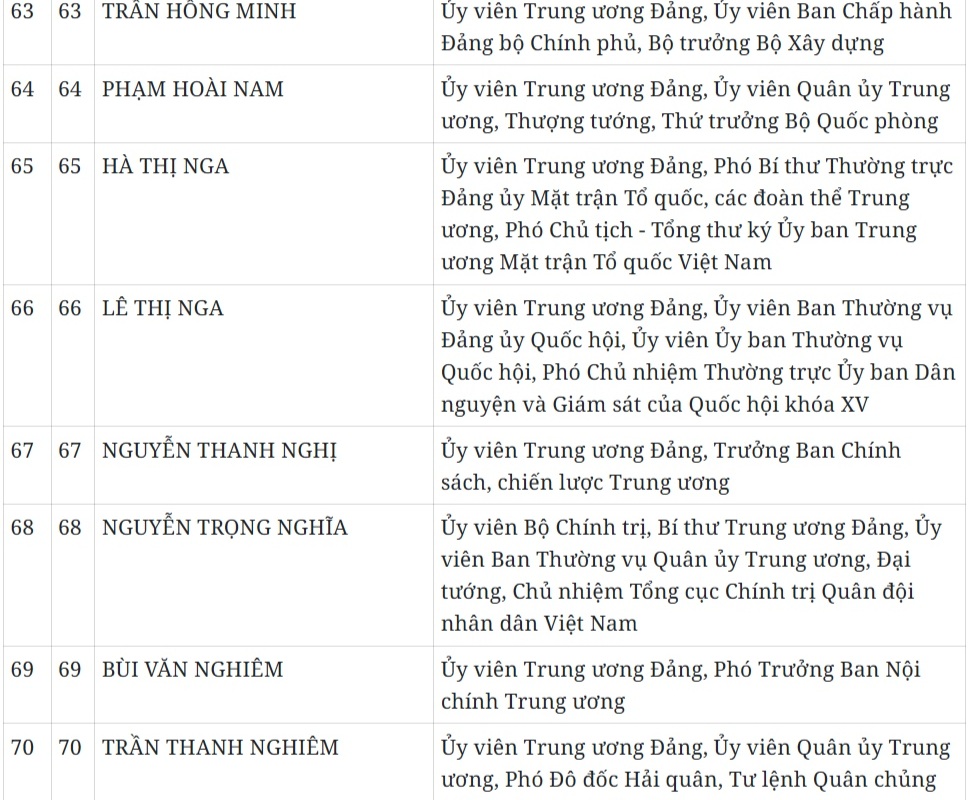 Danh sách 180 Ủy viên chính thức Ban Chấp hành Trung ương Đảng khóa XIV: