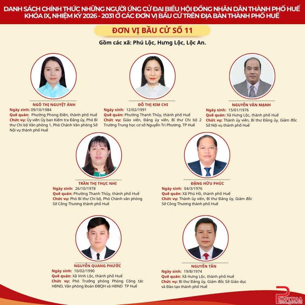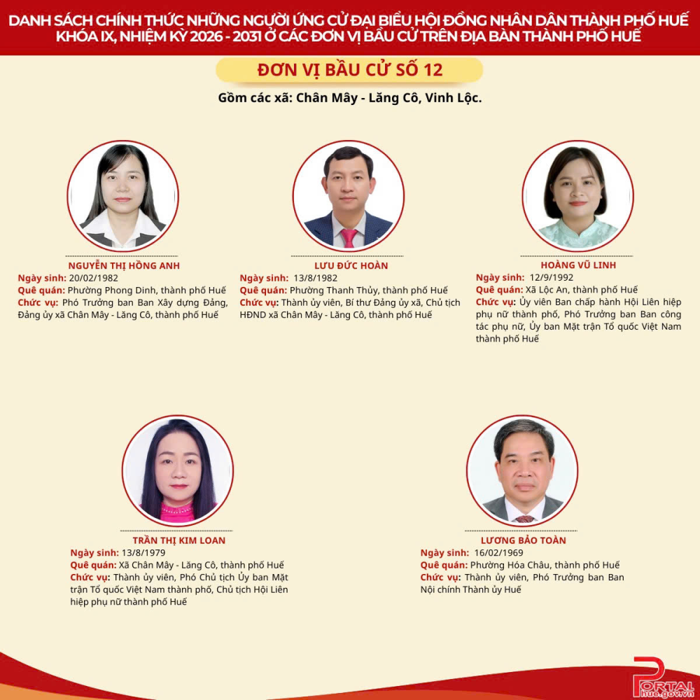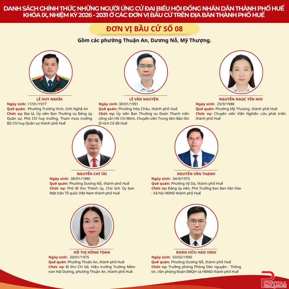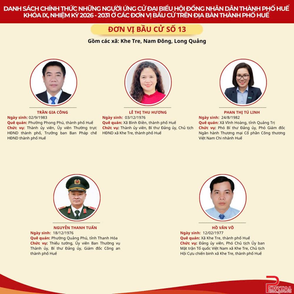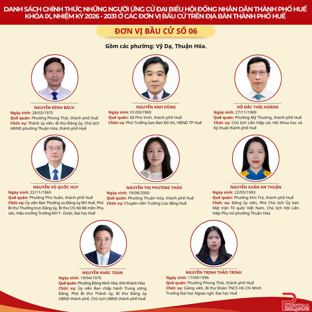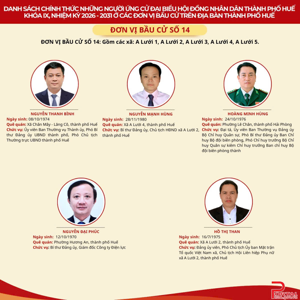 Cổng Thông tin điện tử trân trọng giới thiệu danh sách chính thức 90 người ứng cử đại biểu Hội đồng nhân dân (HĐND) thành phố Huế khóa IX, nhiệm kỳ 2026 - 2031 tại 14 đơn vị bầu cử trên địa bàn.