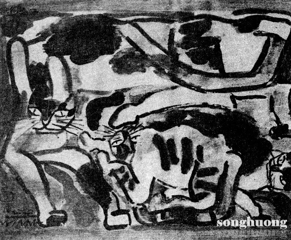 | Tác phẩm “Mèo ba” của họa sĩ Nguyễn Sáng, 1977, bột màu, (sưu tập tư nhân) |