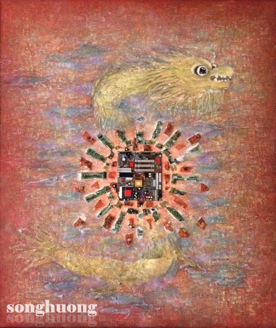 Tác phẩm Bay lên Việt Nam (sơn dầu, cọ dừa & linh kiện điện tử) của họa sĩ Thân Văn Huy
