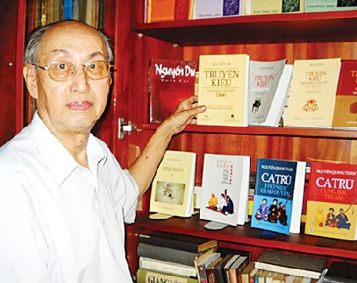 Nguyễn Quảng Tuân xuất thân là nhà giáo. Ông có một cuộc sống thanh đạm và nghiêm cẩn. Vì mê sách cổ, thích nghiên cứu chữ nghĩa mà ông từng gặp hệ lụy. Nhưng ông không nản chí, vì đối với ông bể học thật vô cùng và chuyện đúng sai là lẽ thường tình. Trò chuyện với chúng tôi, bậc lão thành tâm sự: “Đời tôi sống vui vì sách. Nhờ trời đến tuổi này tôi vẫn mạnh khỏe, minh mẫn để tiếp tục đọc, học và nghiên cứu sách”. Rồi ông đưa chúng tôi đến từng tủ sách, mở cửa, giới thiệu say sưa những cuốn sách cổ mà ông tâm đắc nhất. Ông còn lật từng trang sách, giải thích về sự quý giá của sách lẫn công phu của người làm sách, nhất là những bản khắc in Truyện Kiều bằng chữ Nôm được ông mang về từ Pháp, từ Mỹ. Nhìn ông, chúng tôi cảm thấy sách cổ như đang được “gọi hồn” về trong tình yêu của ông.