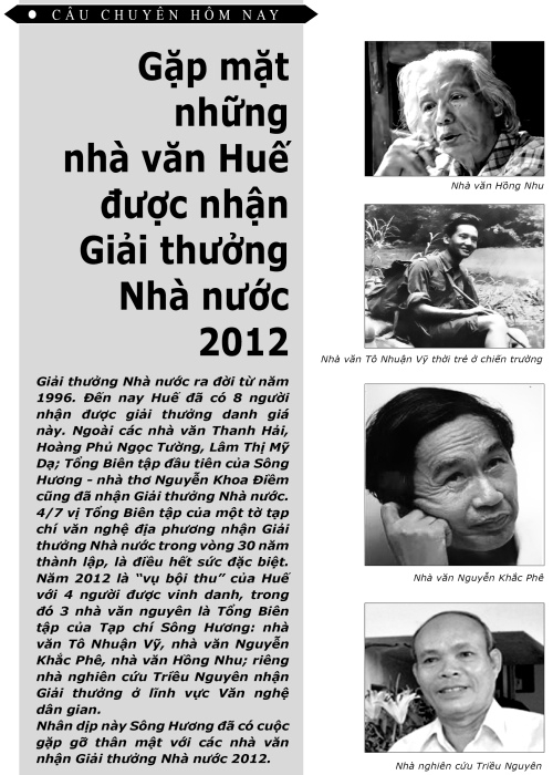 4/7 Tổng Biên tập của một tờ tạp chí văn nghệ địa phương nhận Giải thưởng Nhà nước trong vòng 30 năm thành lập, là điều hết sức đặc biệt. Năm 2012 là “vụ bội thu” của Huế với 4 người được vinh danh, trong đó 3 nhà văn nguyên là Tổng Biên tập của Tạp chí Sông Hương: nhà văn Tô Nhuận Vỹ, nhà văn Nguyễn Khắc Phê, nhà văn Hồng Nhu; riêng nhà nghiên cứu Triều Nguyên nhận Giải thưởng ở lĩnh vực Văn nghệ dân gian.